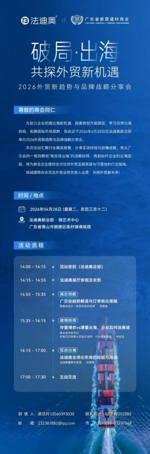 • 2026-04-23 13:40:38重磅预告 4月28日,法迪奥钢艺术中心将举办2026外贸新趋势与品牌战略分享会。 本次分享聚焦三大核心亮点:广交会一...[详细]