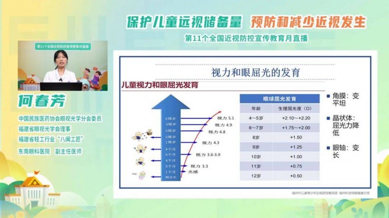 中国民族医药协会眼视光学分会委员、福建省眼视光学会理事、东南眼科医院何春芳副主任医师从儿童青少年的视觉发育特点出发,系统介绍了学龄前至中小学阶段的视觉健康干预措施,着重讲解保护低龄儿童远视储备的重要性和手段。此外,她还系统讲解了近视的高危因素、高度近视带来的眼病风险以及科学防控手段,并结合门诊经验,分析讲解了学生、家长在近视矫正方面的常见误区。