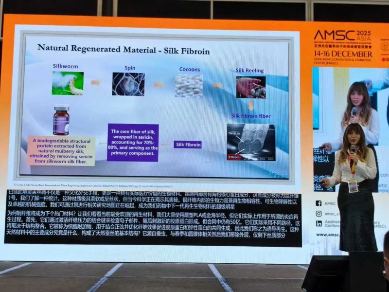回顾此次大会焦点,是品牌在生物材料领域的另一项里程碑式创新。澳门银葵医院张素珊(Susan)博士在大会专题环节,就丝素蛋白生物材料在美学修复领域的创新应用发表了深度报告。