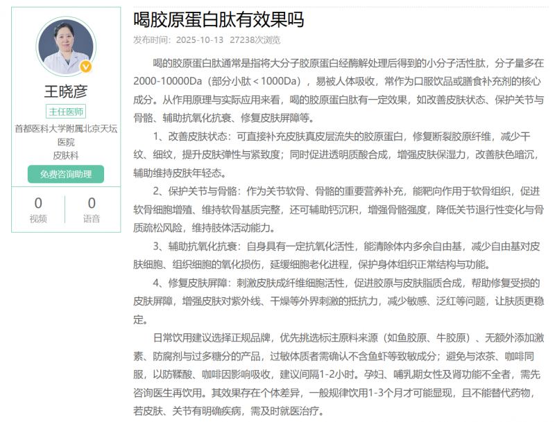 她进一步详细阐释其作用“改善皮肤状态:可直接补充皮肤真皮层流失的胶原蛋白,修复断裂胶原纤维,减少干纹、细纹,提升皮肤弹性与紧致度;同时促进透明质酸合成,增强皮肤保湿力,改善肤色暗沉,辅助维持皮肤年轻态。保护关节与骨骼:作为关节软骨、骨骼的重要营养补充,能靶向作用于软骨组织,促进软骨细胞增殖、维持软骨基质完整,还可辅助钙沉积,增强骨骼强度,降低关节退行性变化与骨质疏松风险,维持肢体活动能力。辅助抗氧化抗衰:自身具有一定抗氧化活性,能清除体内多余自由基,减少自由基对皮肤细胞、组织细胞的氧化损伤,延缓细胞老化进程,保护身体组织正常结构与功能。修复皮肤屏障:刺激皮肤成纤维细胞活性,促进胶原与皮肤脂质合成,帮助修复受损的皮肤屏障,增强皮肤对紫外线、干燥等外界刺激的抵抗力,减少敏感、泛红等问题,让肤质更稳定。”此外,医生种轶文也强调:“胶原蛋白肽是胶原蛋白经过酶解后形成的小分子多肽,分子量通常在1000-3000道尔顿之间,部分产品平均分子量小于1000道尔顿,吸收更好,其对人体有一定的作用功效,如改善皮肤状态、维护关节与骨骼健康、滋养头发与指甲、优化肠道与免疫系统、促进肌肉合成与恢复等。”