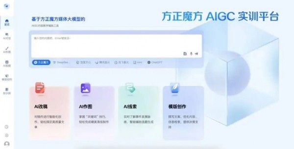 本届研习营活动中,备受关注的焦点便是方正魔方AIGC实训平台。方正电子依托在传媒领域深厚技术底蕴以及多年应用实践,结合传媒市场新型人才需求,与院校合作共建课程和人才培养,推出方正魔方AIGC实训平台,一站式解决文、图、音视频多模型集约性应用,与媒体生产流程,岗位角色紧密结合,提供全套的课程体系建设方案。