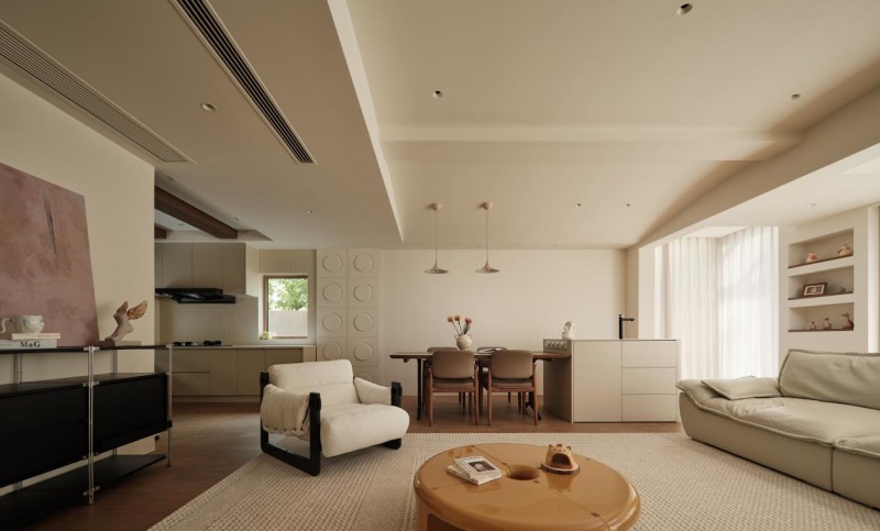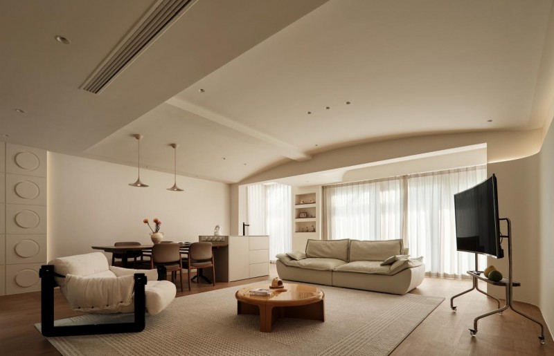 梁柱结构被巧妙转化为流动的圆弧语言,顶墙同色延展,模糊边界,拉伸空间维度。家具围绕一岁宝宝的安全需求,做到了布艺沙发柔软,茶几圆角无棱,角落暗藏探索趣味,保证了温馨舒适的氛围。