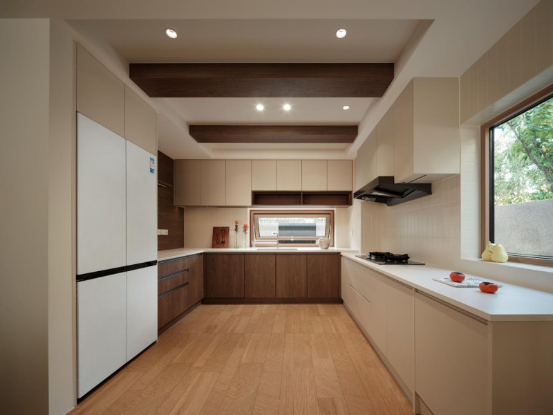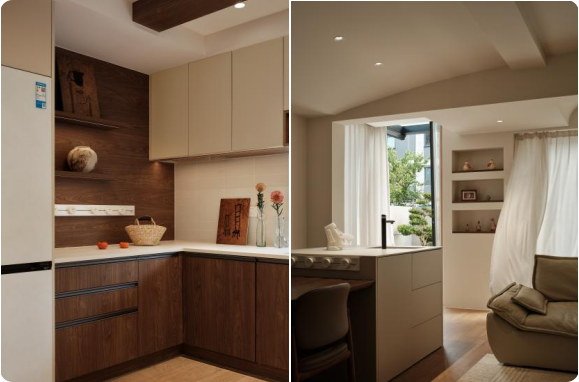 厨房突破传统封闭属性:扫拖机器人专属收纳位嵌入柜体,活动挡板实现“用时展开、闲时隐藏”;冰箱与橱柜严丝合缝,维持立面简洁。一扇可开启窗扇,不仅引入自然通风,更让烹饪者与庭院产生情感互动。餐厨不再是后勤区,而是生活剧场的中心舞台。