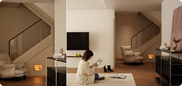 家居空间中植入一些温馨的小细节,原本平平无奇的楼梯,以内嵌光体为核心,布置家居场景,营造温暖仪式感,让每一次居家都充满专属的温馨与期待。