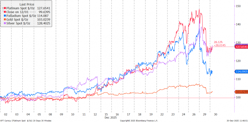 三是12月白银现货逼仓行情并不极端,白银租赁利率维持在合理区间,意味着短期内实物暂不短缺。然而,同一时间铂金和钯金(尤其是内盘)出现了由“交割问题”引发的、脱离基本面的资金炒作式暴涨。从外盘价格涨幅来看,12月以来,铂金>白银>钯金>黄金。