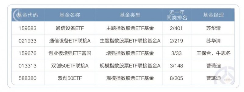 在富二家的ETF产品矩阵中,通信ETF(159583)及A类联接基金(021933)通过跟踪中证通信设备主题指数,实现了对光模块、AI硬件、卫星互联网等热点赛道的布局,近1年排名同类第2(2/401、2/219);双创50ETF(588380)及A类联接基金(013313)、创业板增强ETF富国(159676)因其聚焦科创板、创业板市场,锚定更强的上涨弹性,近1年在同类产品中的表现也比较优异。