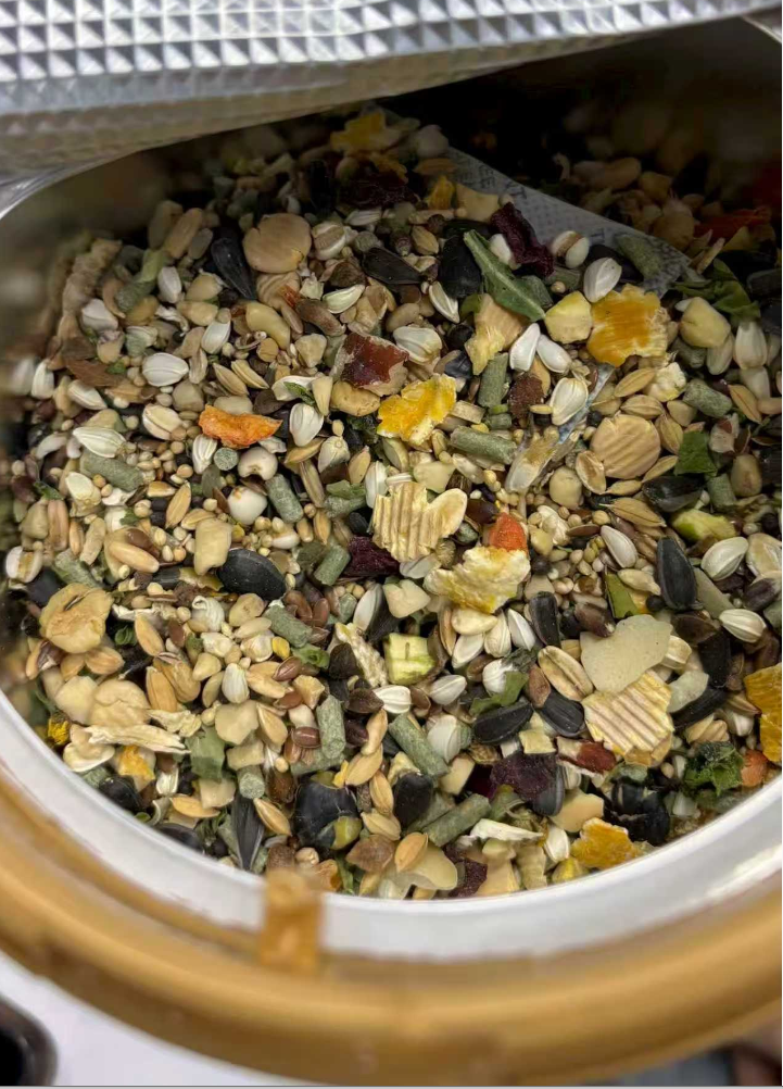 作为一款定位高端的鹦鹉专用种子粮,该产品在原料甄选与配方搭配上尽显匠心。原料方面,产品精选29%进口坚果,涵盖巴旦木果仁、夏威夷果仁、碧根果仁等多种优质坚果,同时搭配60%的果蔬、谷物与籽实,汇聚奇亚籽、亚麻籽、冻干豌豆、羽衣甘蓝等50种天然食材,全方位覆盖鹦鹉生长所需的营养成分。