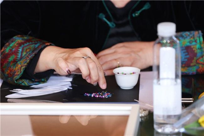 在老师指导下,客户们亲手将晶莹的水晶片、羽毛与各色珠饰巧妙组合。