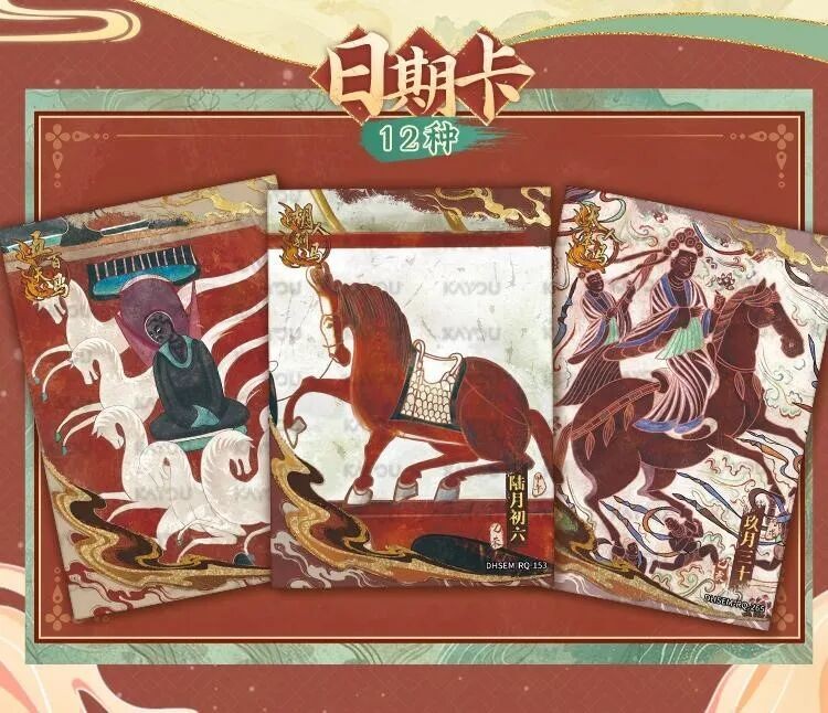 敦煌文化中有关马的经典作品被选取出来,呈现在了卡牌的纸面上。“十二马卡”,即是把这些画作分门别类,浓缩成12张卡牌,每张卡面对照1个丙午年农历月,既能单独欣赏,也能插放在限定发行的2026年农历敦煌壁画台历上,兼具卡册的实用功能与美感。在日期卡的基础上,卡游还特别设计制作了24张节气卡和8张节日卡。