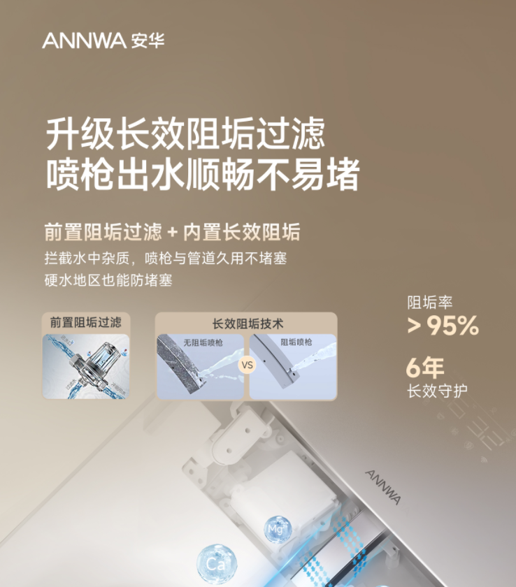 安华GT5Pro智能马桶在洁净这件事上,从水路源头开始层层把关,内置长效阻垢系统,阻垢率高达95%,即使在水质偏硬的地区也能确保出水始终强劲顺畅。配合20微米高精度前置过滤器,有效滤除水中泥沙、铁锈、虫卵等杂质,活水即热、0储水设计更是从源头杜绝细菌滋生。其喷枪部分还采用三重净菌技术,座圈则采用360°无缝工艺,杜绝细菌隐匿。从水路到喷枪,从座圈到釉面,安华GT5Pro智能马桶将洁净贯穿每一个细节。