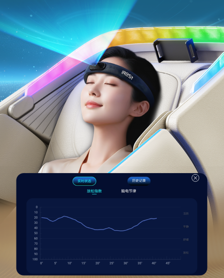 这是M6Pro最黑科技的地方,带上配置的脑波带,就可以实时检测你的放松状态,然后自动调整按摩节奏和力度。启动脑波联动模式后,按摩椅先是用中等力度按了2分钟,然后明显感觉到力度逐渐加重,再慢慢节奏变慢。按摩结束后,APP上显示我的放松指数从“紧张”变成了“深度放松”,也可以实时看到我的脑波曲线变化。