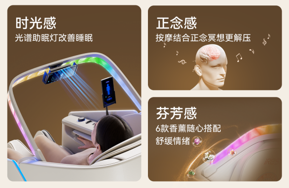 附加功能是不是噱头?首先家用按摩椅一定要带体型检测功能,这个没什么好说的,不同家庭成员体型有差异,要让机器来定位你的肩颈腰背,这样按摩才更准确有效。常规热敷、足底按摩可以看自己是否需要,再去选择对应配置机型。像我们家对产品的附加功能接受度比较高,这次入手的艾力斯特M6Pro还带有香氛、正念助眠音乐和助眠炫彩灯,整体体验下助眠效果还是很不错的,能让人身心都放松。